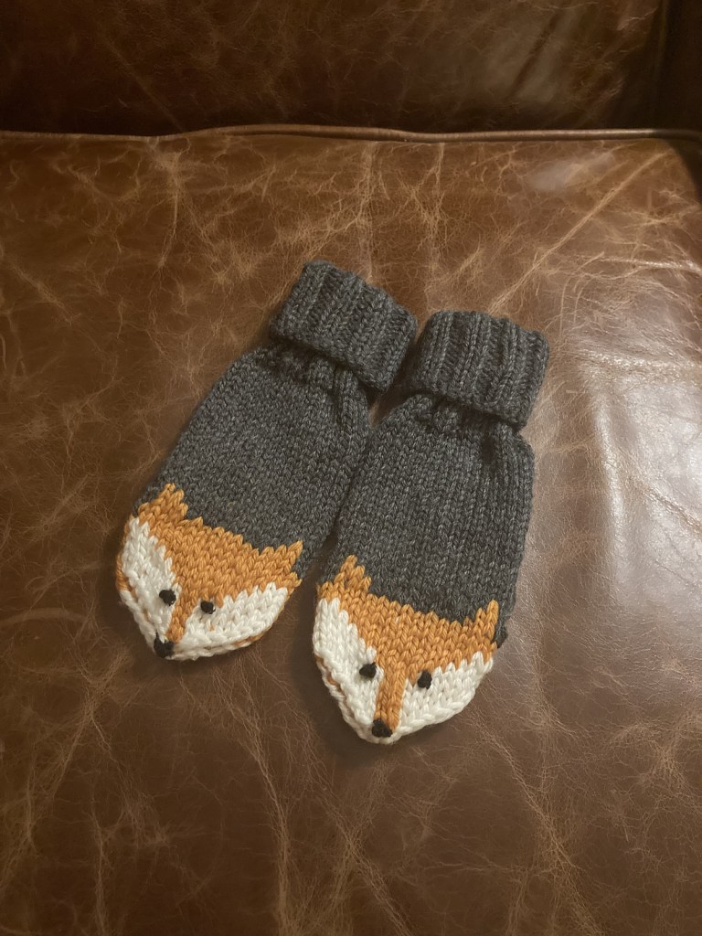 You could say my family has a thing for foxes. So these were the perfect little mitts to keep at my mom’s house for whenever there’s a grandchild around in need of some winter gear. The pattern was quick, easy, and fun: Fox mittens by Eva Norum Olsen.